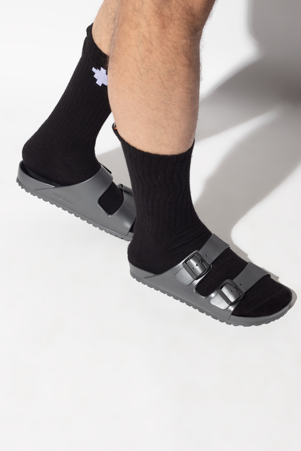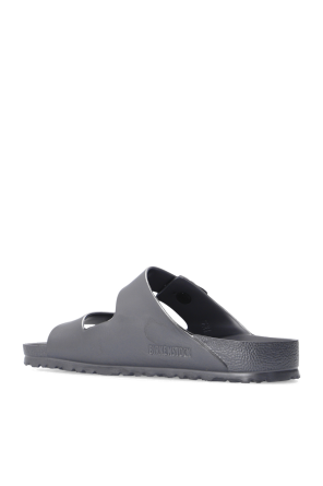 Birkenstock的银色调Arizona EVA拖鞋。EVA泡沫质。黑色调搭扣带含logo。银色调EVA鞋底。