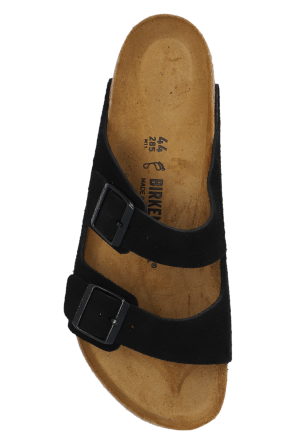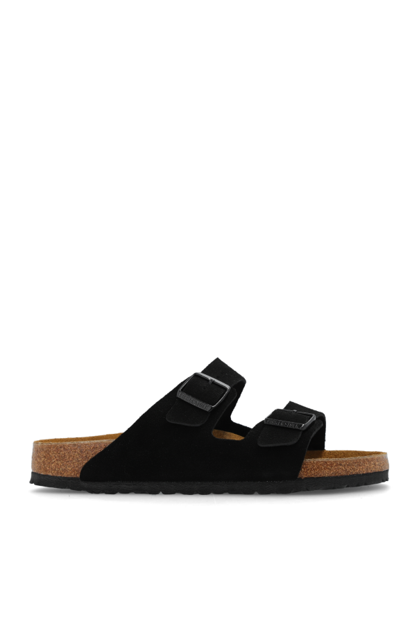 Black ‘Arizona BS’ slides from Birkenstock. Made of suede, this model sits on a black EVA foam sole and features a standard-width, anatomically-shaped cork-latex footbed, adjustable buckle straps and an embossed logo on the side.