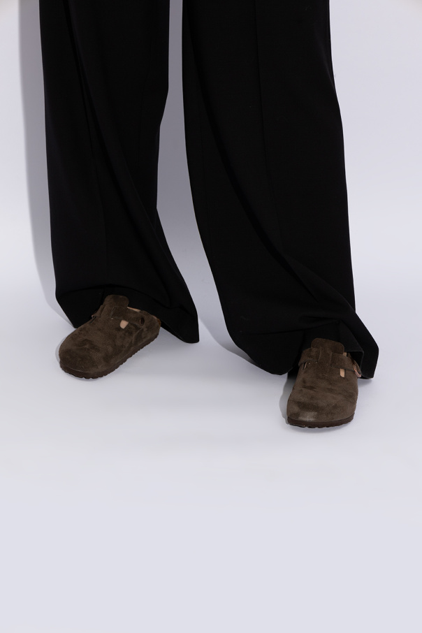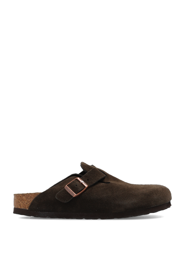 Birkenstock的深棕色Boston BS拖鞋。采用绒面皮制成。正面配有可调节的带扣带。侧面有压花标志。带有锥形状的解剖学设计的软木乳胶鞋垫。深棕色EVA泡沫外底。