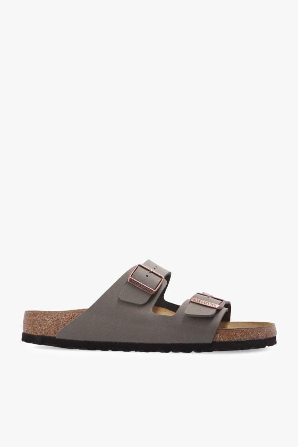 Greyish brown ‘Arizona BS’ slides from Birkenstock. Made with the skin-friendly Birko-Flor®, this model features adjustable straps with logo buckles and a dark brown sole in natural cork and EVA.