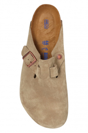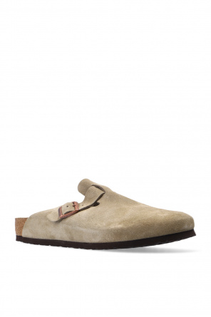 Birkenstock的米色'Boston BS'拖鞋。由绒面革质制成。附饰带,饰有黄铜色logo压花搭扣。EVA中底。深棕色软木鞋底。