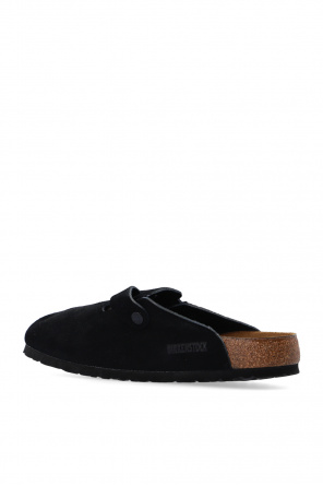 Birkenstock的黑色'Boston BS'拖鞋。由绒面革材质制成,配有带徽标压花搭扣的肩带,天然软木和 EVA 鞋底。