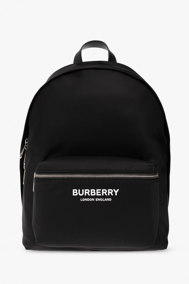 Black backpack from Burberry. Embellished with a raised white logo, this design features a two-way zip fastening, a zip pocket on the front, a half-round handle, adjustable shoulder straps, silver-tone metal hardware and one internal compartment with one zip pocket and one slip pocket.