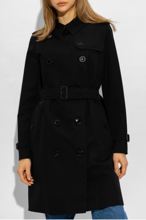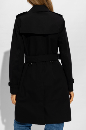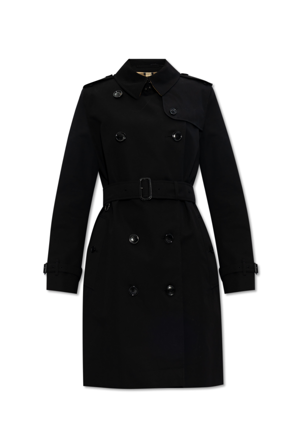 Black trench coat from Burberry. Made of cotton with a double-breasted silhouette, this style features a waist-cinching tie belt, button fastenings, two slip pockets, shoulder epaulettes and long sleeves.