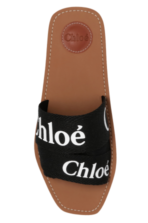Chloé的黑色'Woody'拖鞋。棕色橡胶鞋底。饰有白色徽标印花。