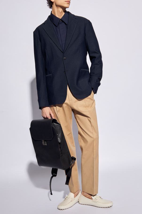 Giorgio Armani的深蓝色平驳领西装外套,纽扣开合。正面设有两个口袋。长袖。