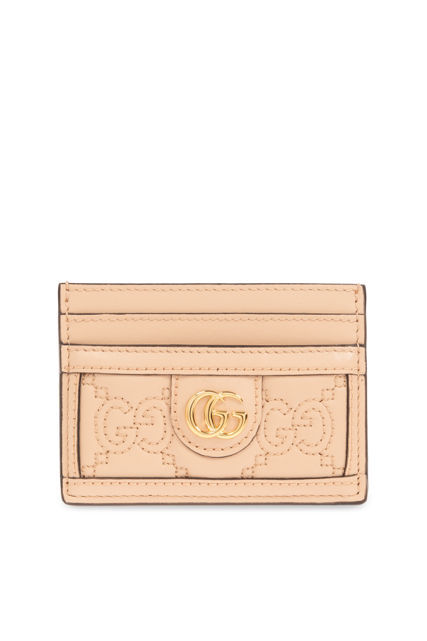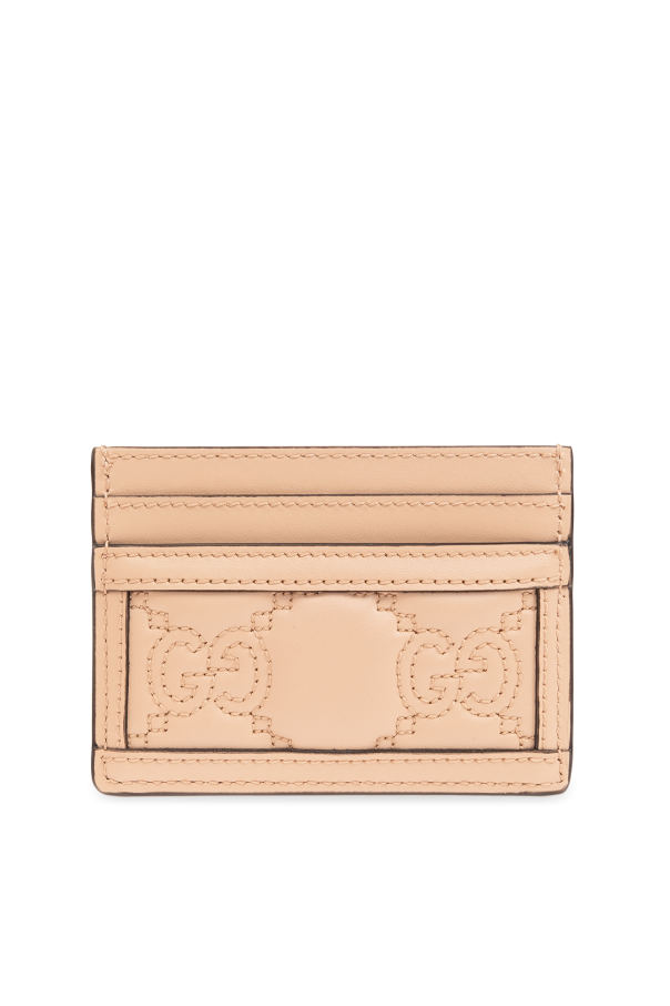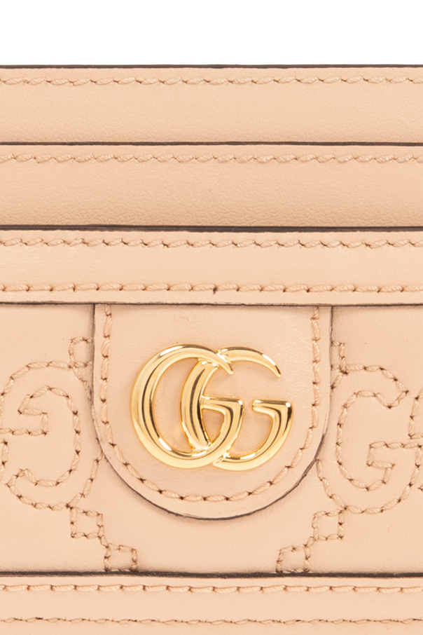 Beige card case from Gucci. Made of leather, this item is embellished with a quilted monogram and showcases a gold-tone metal logo plaque on the front, four card slots and one slip pocket.