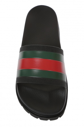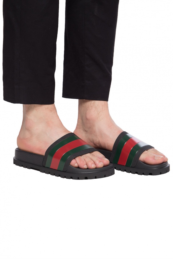 来自古驰 (Gucci)的黑色橡胶拖鞋。标志性的绿-红-绿"网格"条纹。黑色橡胶鞋底。