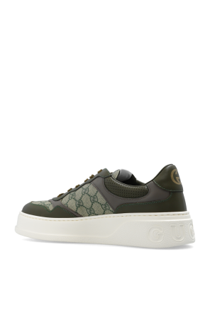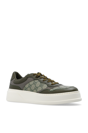 Gucci的绿灰色运动鞋,系带设计。采用皮革和面料制成。饰有GG单字母徽标图案。灰色橡胶外底。