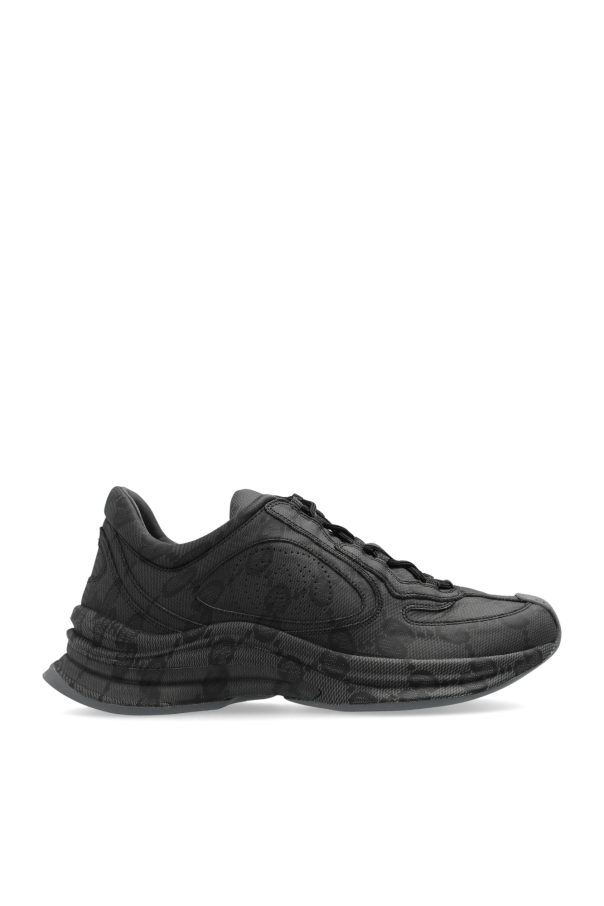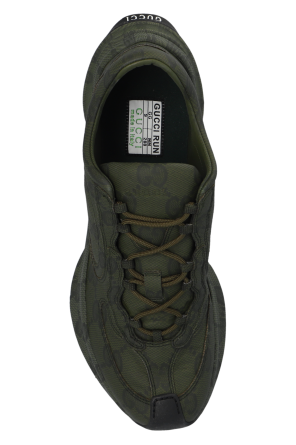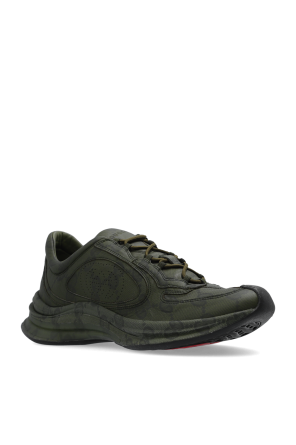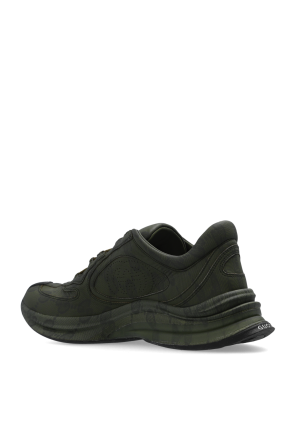 Gucci的深绿色Gucci Run系列运动鞋,系带设计。采用带有品牌标志的小牛皮制成。鞋舌和后部饰有标志。深绿色、黑色和红色橡胶外底。
