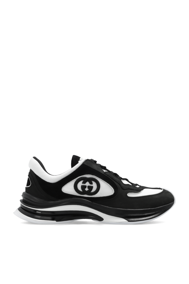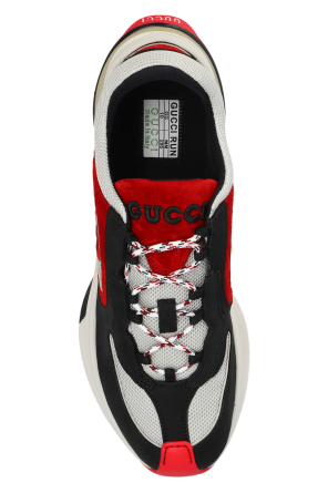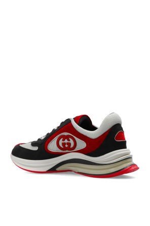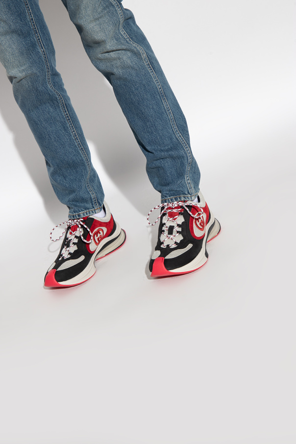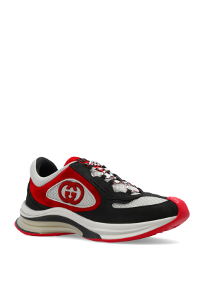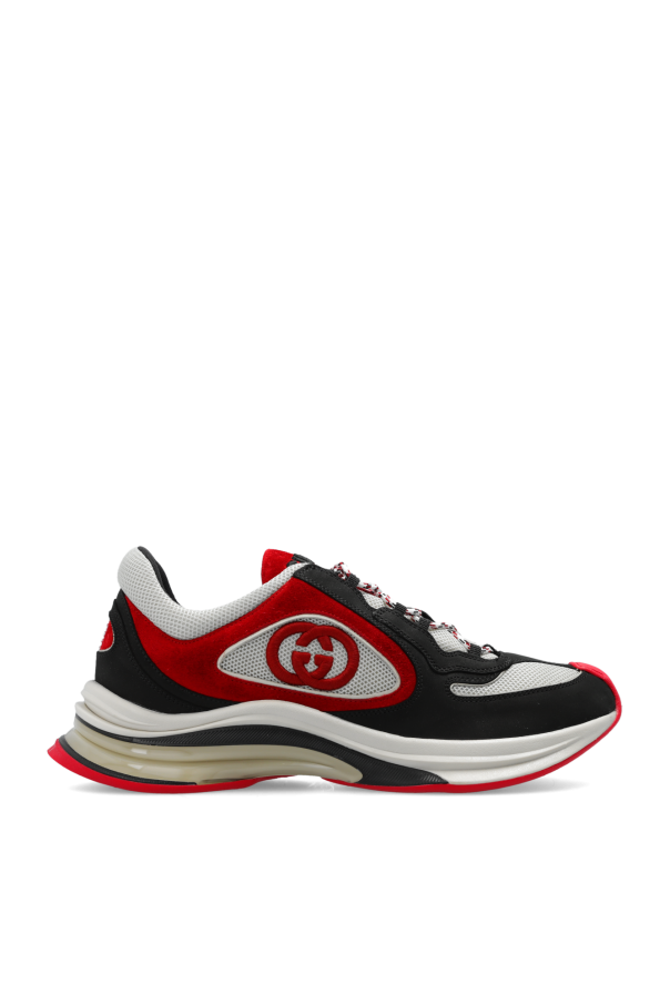 Gucci的白黑红色运动鞋,鞋带设计。采用皮革和面料制成。饰有鞋面的穿孔细节和刺绣标志。红黑色橡胶外底。