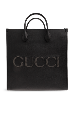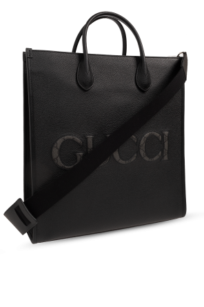 Gucci的黑色托特包,中号,采用皮革制成。龙虾扣开合。正面饰有灰黑色GG Supreme帆布凸起标志。两个半圆形手柄。可拆卸可调式肩带。内部设有一个主隔层和一个拉链口袋。银色金属配件。