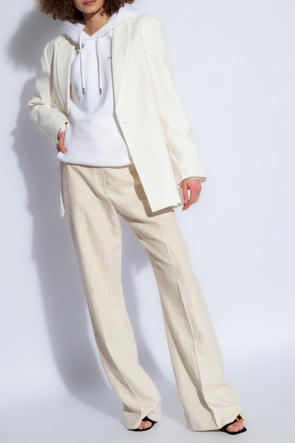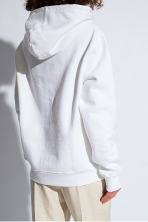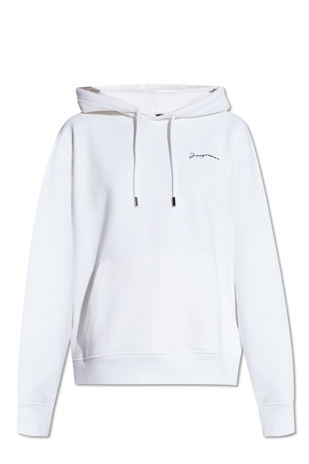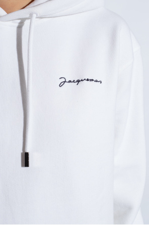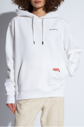 Jacquemus的白色Brode连帽衫,采用棉质面料制成。正面饰有黑色高绣标志。抽绳兜帽。插袋。长袖和下摆设有松紧饰边。