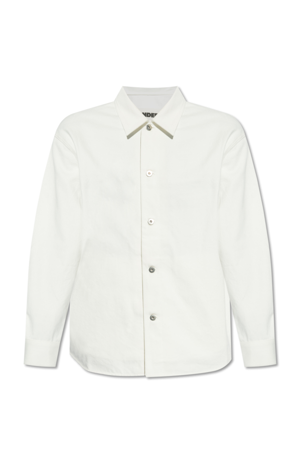 JIL SANDER的白色宽松牛仔衬衫,纽扣开合。翻领。两个插袋。长袖,纽扣袖口。