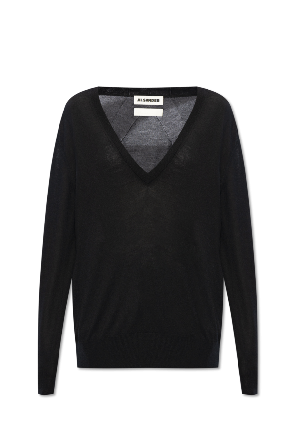 JIL SANDER的黑色羊绒毛衣。采用羊绒制成。V领,下摆和长袖设有松紧饰边。