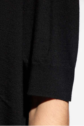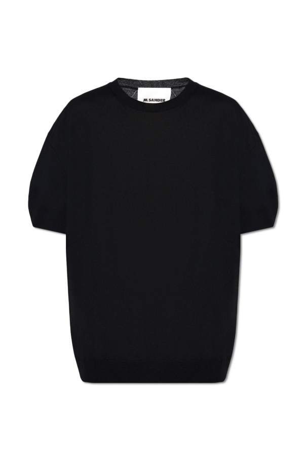JIL SANDER的黑色T恤。采用美丽诺羊毛制成。圆领,短袖和下摆设有松紧饰边。