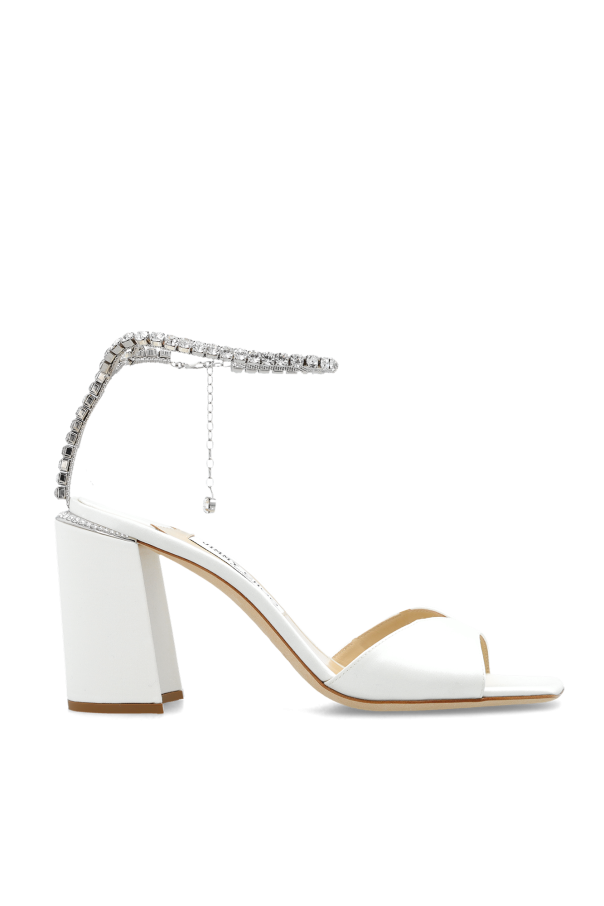 Jimmy Choo的白色Saeda缎面高跟凉鞋。可调搭扣踝带。方头。奶油色皮革鞋底。