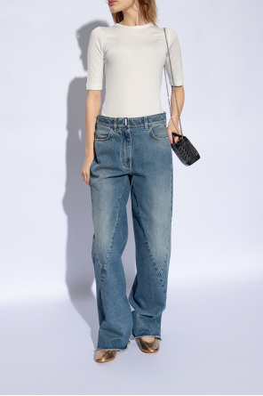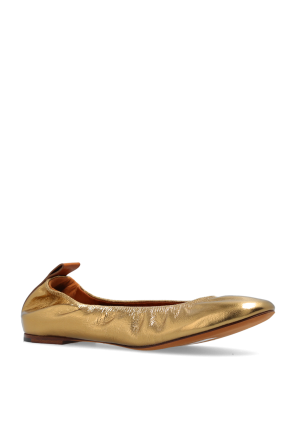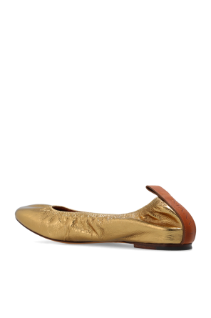 Gold-tone ballet flats from Lanvin. Made of leather, this pair features a brown logo-embossed pull strap, gathers and beige leather sole.