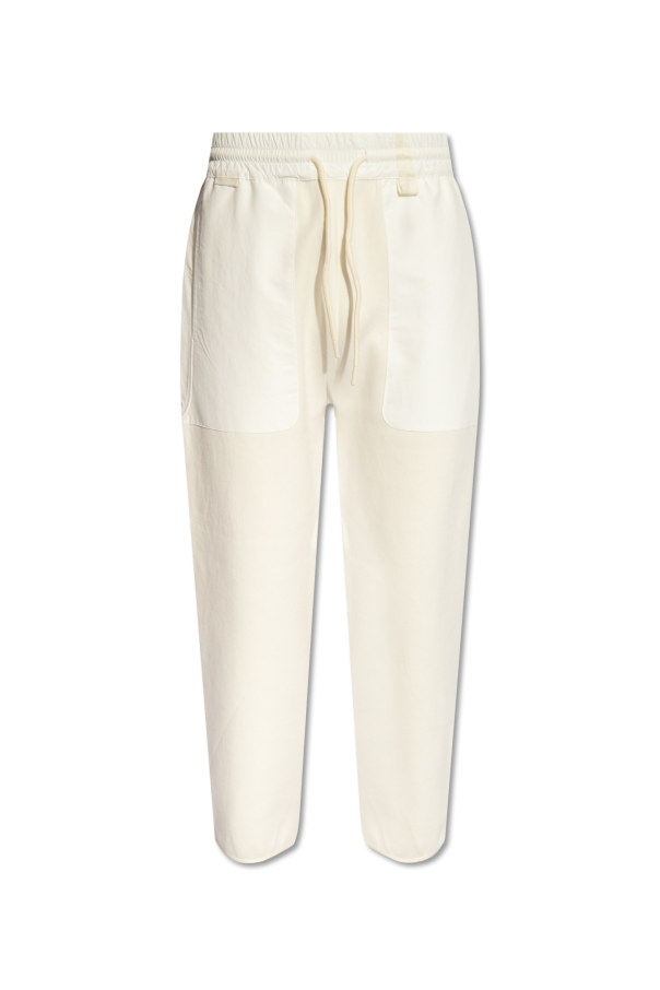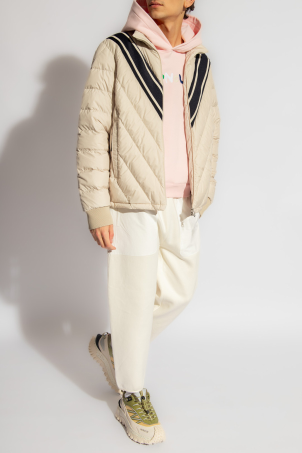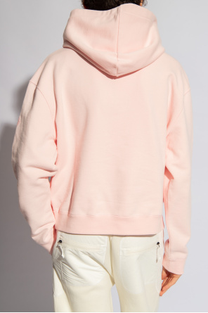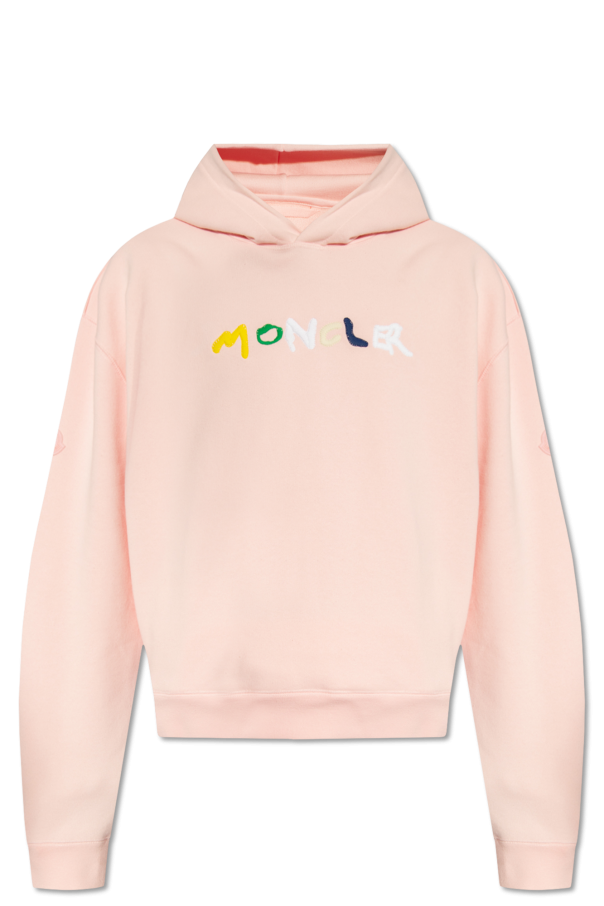 Moncler的浅粉色连帽衫。采用棉质面料制成。正面饰有彩色刺绣标志。袖子上有字母图案贴花。两个插袋。长袖和下摆设有松紧饰边。
