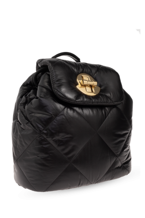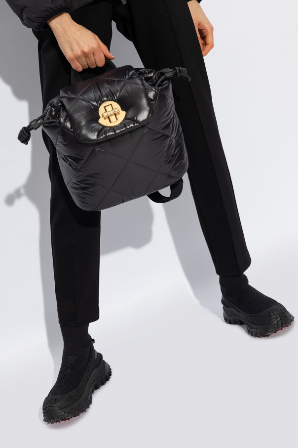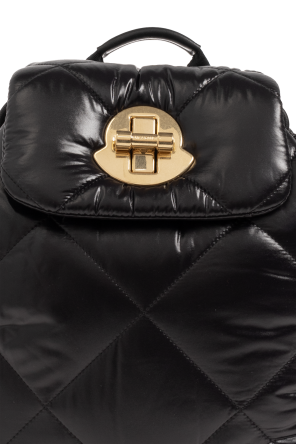 Moncler的黑色Puf背包,绗缝效果。采用带金属扭转式标志造型搭扣的盖子。半圆形手柄。可调节肩带。内部设有抽绳主隔层和一个插袋。做旧金色金属配件。