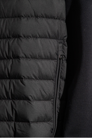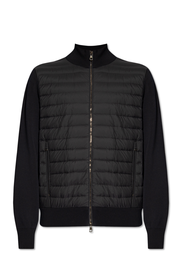 Moncler的深蓝色立领羊毛衫。部分采用棉质面料。羽绒绗缝前身。隐藏式双向拉链开合。袖子饰有标志贴花。两个拉链口袋。长袖和下摆设有松紧饰边。