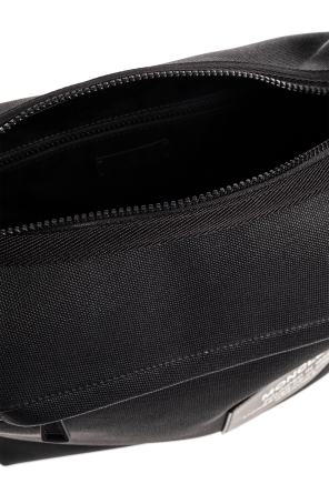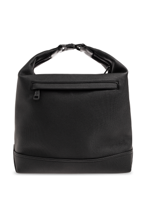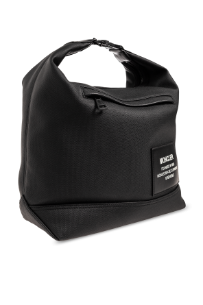 Black ‘Nakoa’ handbag from Moncler. Made from coated fibre with waterproof properties, this design fastens via a zip and showcases a black and white logo patch on the front, one half-round handle with a magnetic snap, two removable shoulder straps, black metal hardware and one internal compartment with a zip pocket.