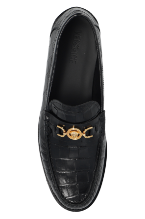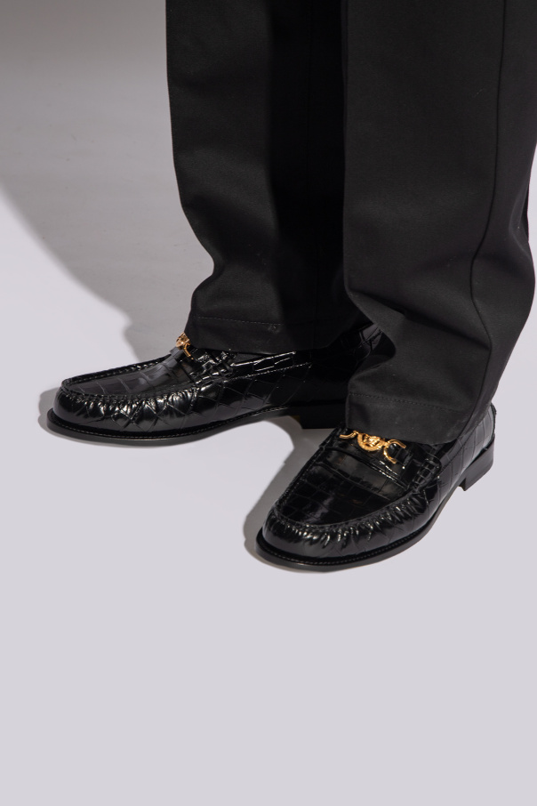 Black loafers from Versace. Made from leather with a crocodile skin effect, this model sits on a black leather sole and showcases gold-tone hardware with the brand's signature Greca and Medusa face motifs.