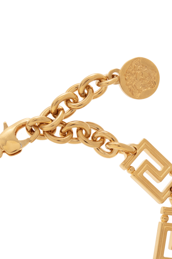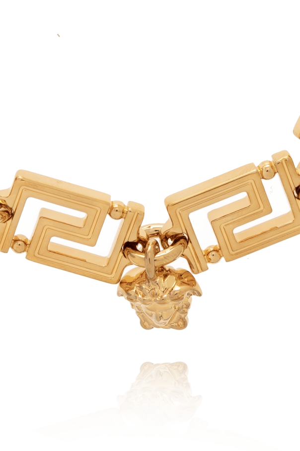 Gold-tone bracelet from Versace. This item adjusts via a lobster clasp and showcases the brand's Greca motif and a signature Medusa face pendant.