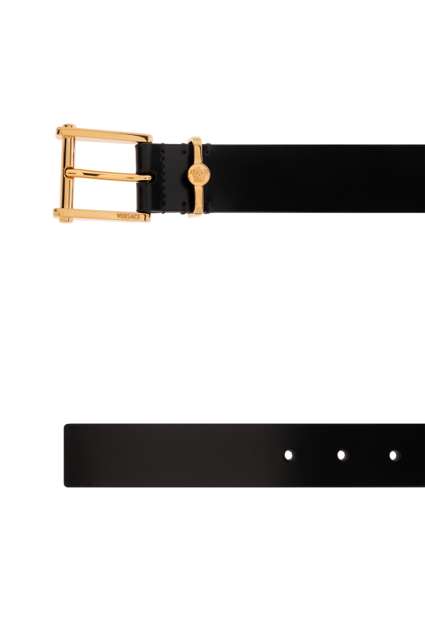 Versace的黑色皮带。采用光滑皮革制成。金色扣环饰有特色的美杜莎头像和刻有品牌标志。