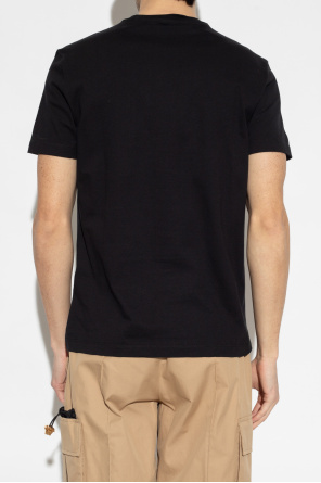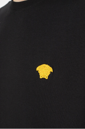 Versace的黑色T恤。采用棉质面料制成。正面饰有黄色刺绣的梅杜莎头图案。松紧圆领,短袖。