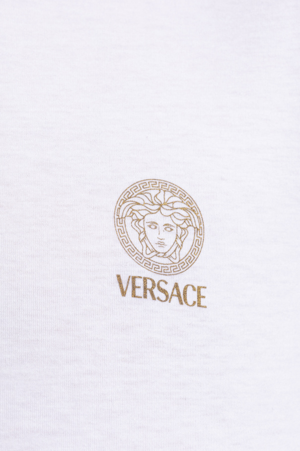 White T-shirt two-pack from Versace. Made of cotton with a form-fitting silhouette, each item features a round neck, short sleeves and a printed gold-tone logo on the front.