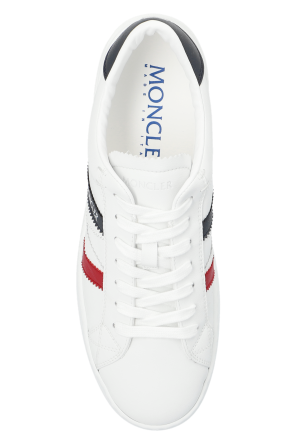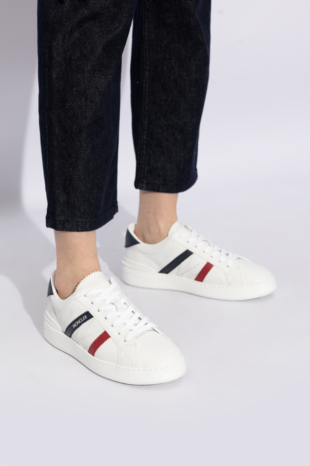 Moncler的白色Monaco运动鞋,系带设计,采用人造皮革制成。饰有标志和红白蓝色贴花。白色橡胶外底。