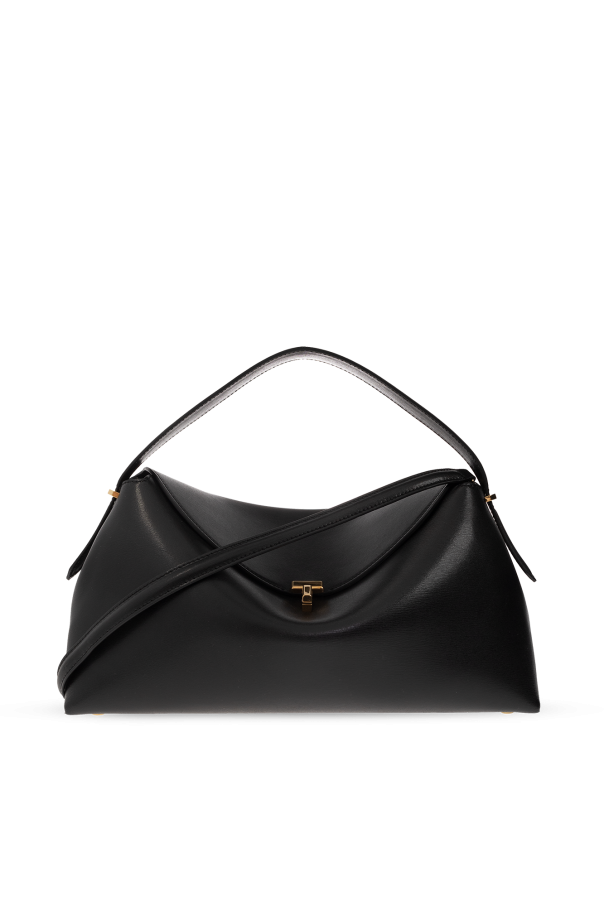 Black shoulder bag from Toteme. Made of leather, this design features a flap with a twist closure, half-round handle, detachable and adjustable shoulder strap, gold-tone metal hardware and one internal compartment with two slip pockets.