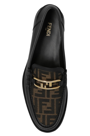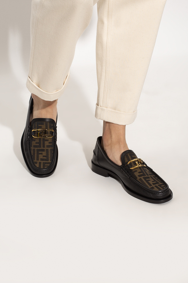 Fendi的黑色和棕色乐福鞋,采用皮革制成,饰有“F”字母组合图案,黑色皮革鞋底配有防滑橡胶嵌件。