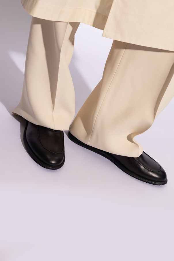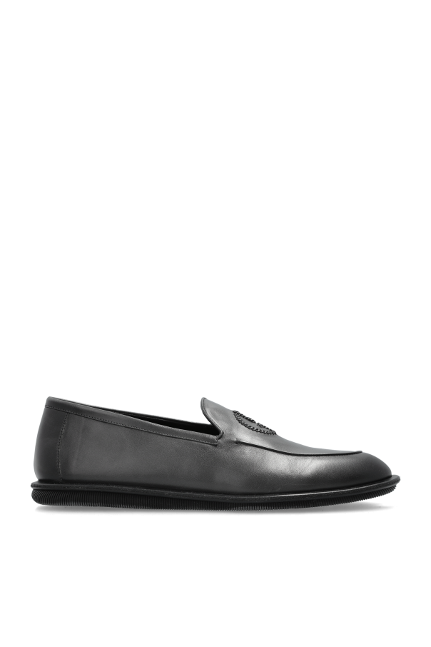 Giorgio Armani的黑色皮质乐福鞋。前面饰有刺绣的字母标志。黑色橡胶鞋底。