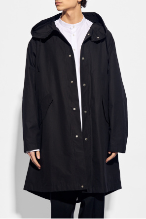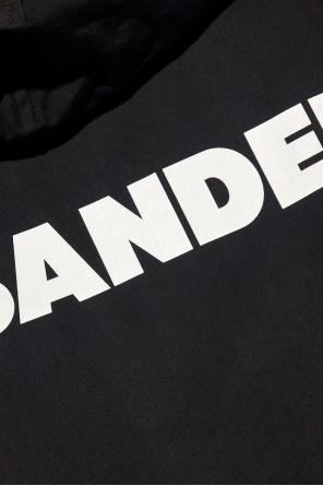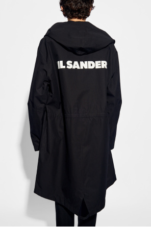 Black coat from JIL SANDER. Made of cotton, this long sleeve design features snap fastenings, a drawstring hood, white logo print at the back and two flap pockets.