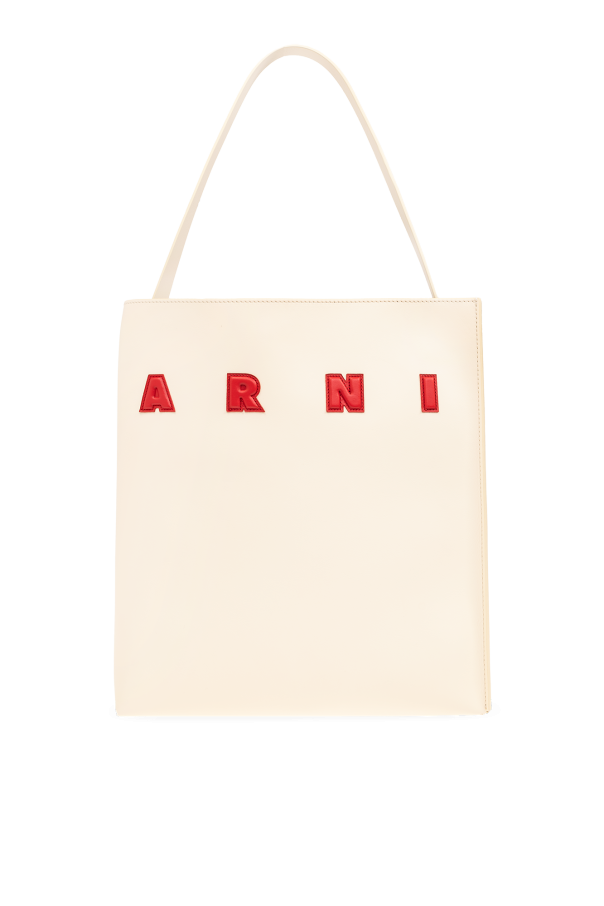 Marni的奶油色Museo托特包。采用小牛皮制成。饰有红色标志贴花。半圆形手柄。内部设有带拉链口袋的主隔层。