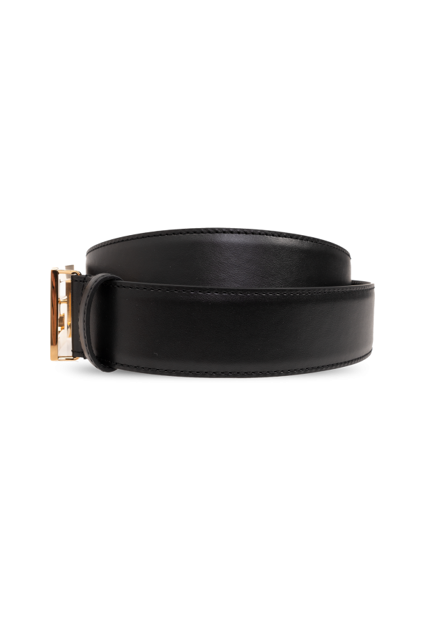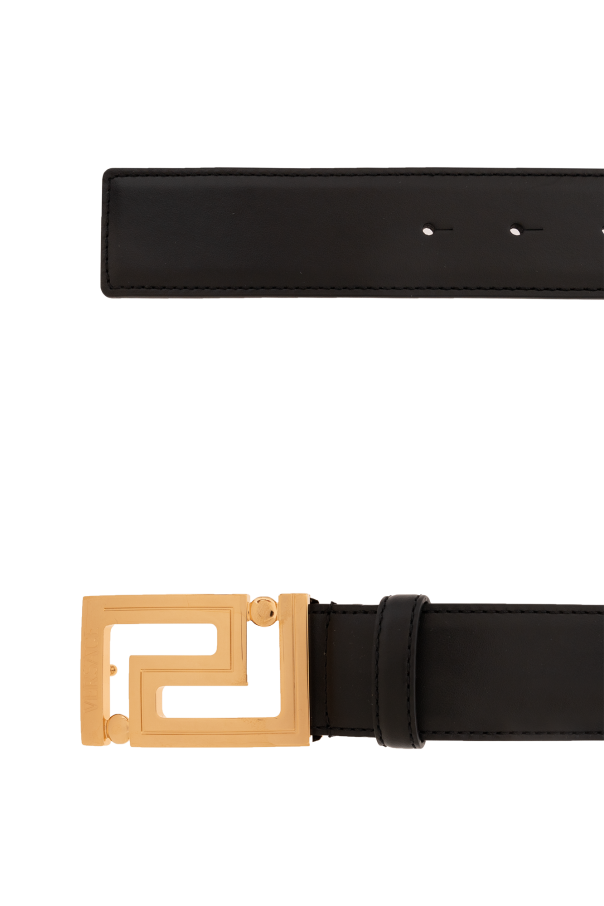 Versace的黑色皮带。采用小牛皮制成。金色‘Greca’图案金属扣环,配有刻有金色标志的图案。