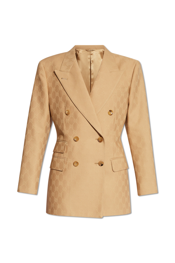 Beige blazer from Gucci. Made from wool with a double-breasted silhouette, this style showcases a ‘GG’ monogram pattern, button fastenings, peak lapels, one welt pocket, three flapped pockets, long sleeves and a single back vent.