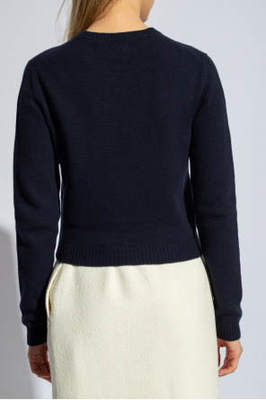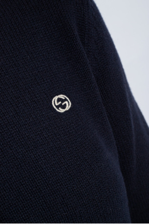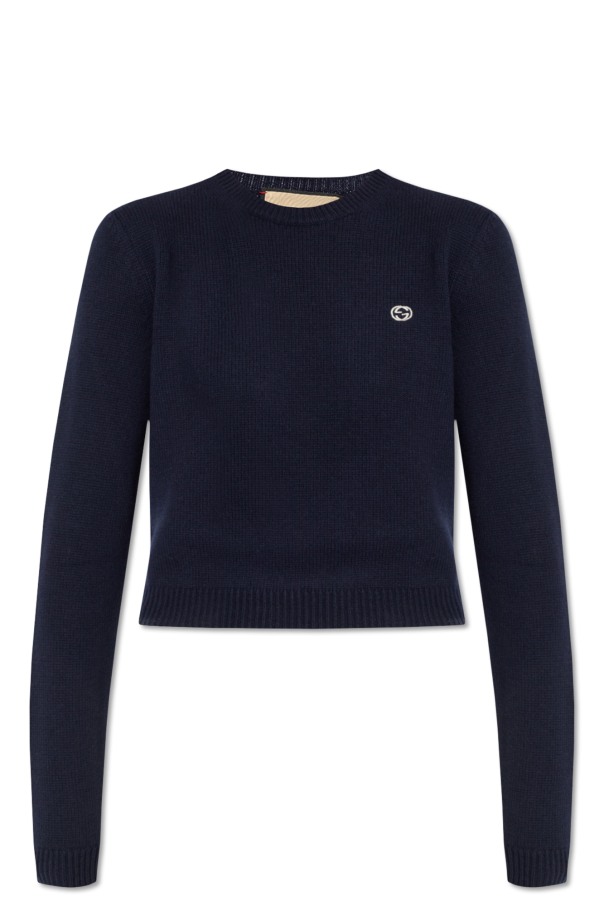 Gucci的深蓝色毛衣。由羊毛和羊绒制成。正面饰有白色刺绣标志。圆领,长袖和下摆设有松紧饰边。