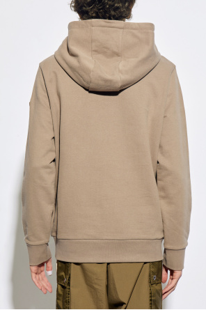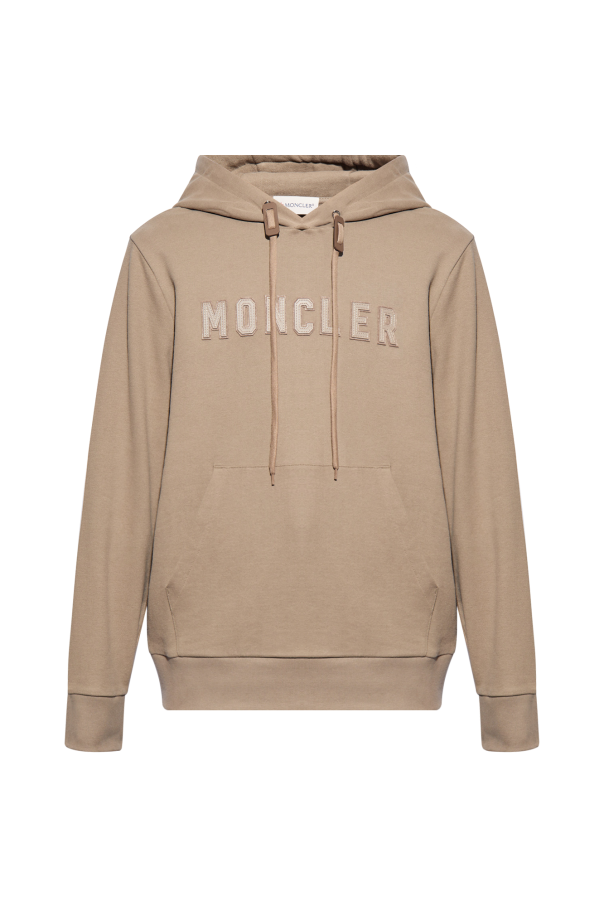 Greyish-beige sweatshirt with a drawstring hood from Moncler. Made from cotton, this style showcases a kangaroo pocket accompanied by logo patches on the front, long sleeves and ribbed trims on the bottom hem and cuffs.