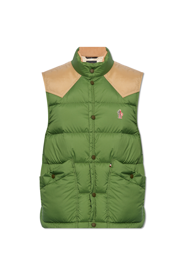 Cream and beige ‘Veny’ quilted down vest from Moncler Grenoble, the ‘Moncler Grenoble Day-Namic’ collection. Emblazoned with a logo patch on the front, this style features a standing collar, snap fastenings and two snap-fastened pockets.