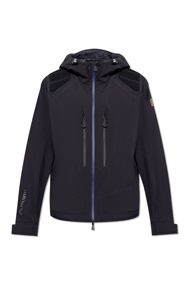 Black ‘Vert’ jacket from Moncler Grenoble, the ‘Moncler Grenoble Day-Namic’ collection. Made of technical fabric with POLARTEC®ALPHA® insulation, this garment features a two-way zip, logo patch on the shoulder, drawstring hood with a peak, shoulders and elbows reinforced with sports mesh panels, two zip pockets, drawstring hem and long sleeves with velcro cuffs.
