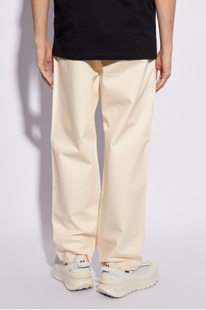 Cream ‘Sportivo’ trousers from Moncler. Made from cotton, this pair falls with slightly tapered legs and features an elasticated waistband accompanied by a hidden zip fly, three slip pockets and a logo patch on the back.