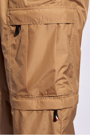 Beige cargo trousers from Moncler. This pair features an elastic drawstring waistband, zip fastening, logo patch, three slip pockets, two zip pockets and detachable legs with drawstrings.