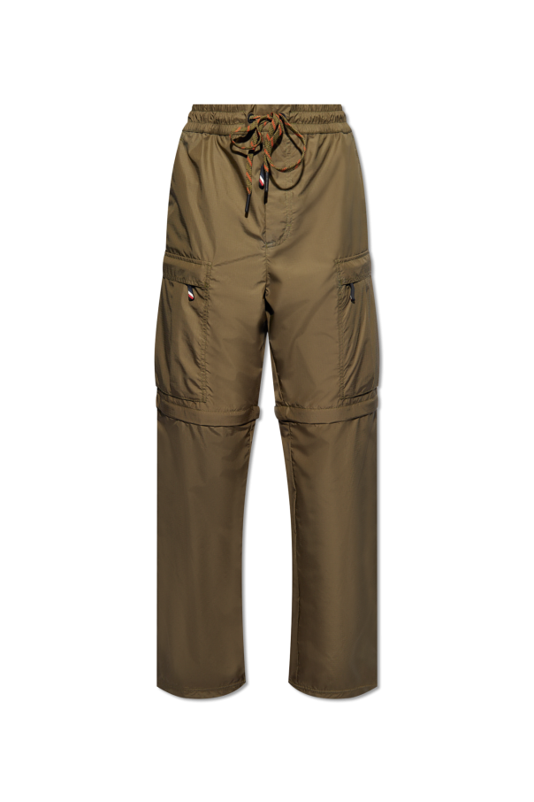 Dark green cargo trousers from Moncler. This pair features an elastic drawstring waistband, zip fastening, logo patch, three slip pockets, two zip pockets and detachable panels with drawstring cuffs.
