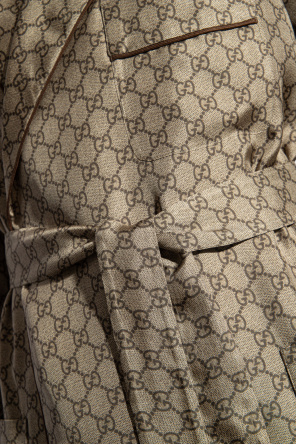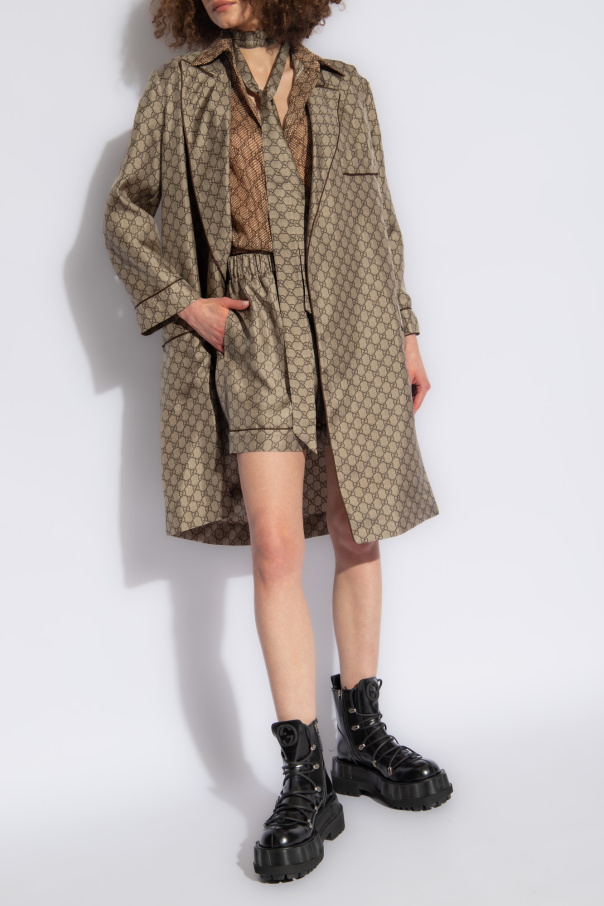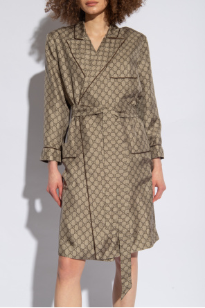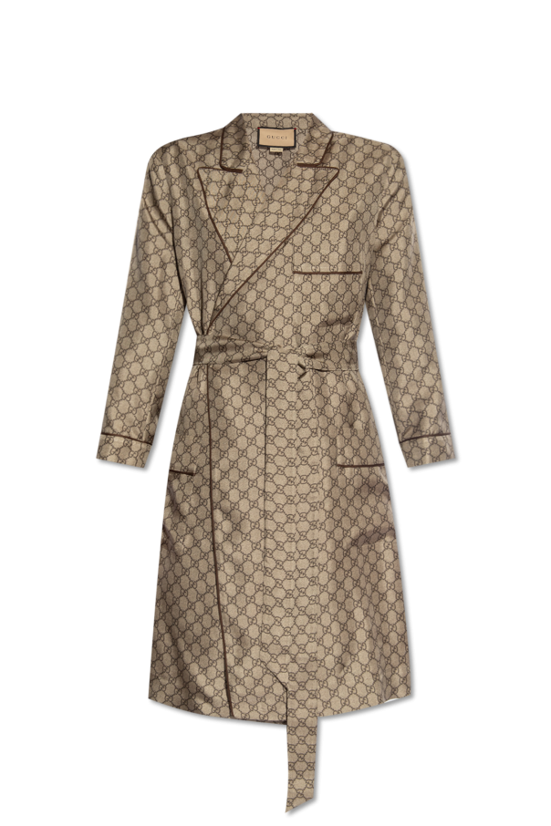 Beige and brown pyjama-style shirt from Gucci. Made of silk, this design features a tied waist belt, monogram pattern, peak lapels, three slip pockets and long sleeves with buttoned cuffs.