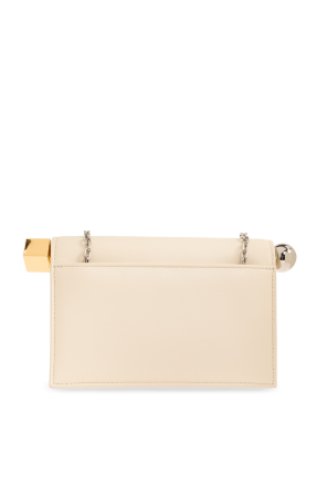 Jacquemus的奶油色La Petite Pochette Rond Carre单肩包,采用羊皮制成。磁扣开合。正面饰有金属logo饰片。背面设有磁扣口袋。提手饰有球形和立方体细节。内部有一个带卡槽的主隔层。金色和银色金属饰件。