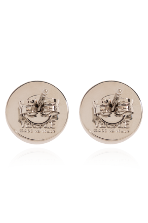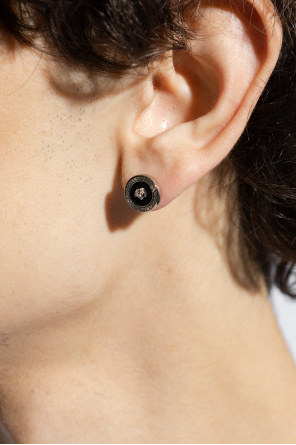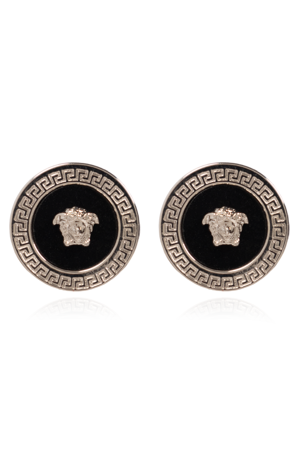 Versace的银黑色黄铜耳环,饰有美杜莎头图案。耳钉设计。