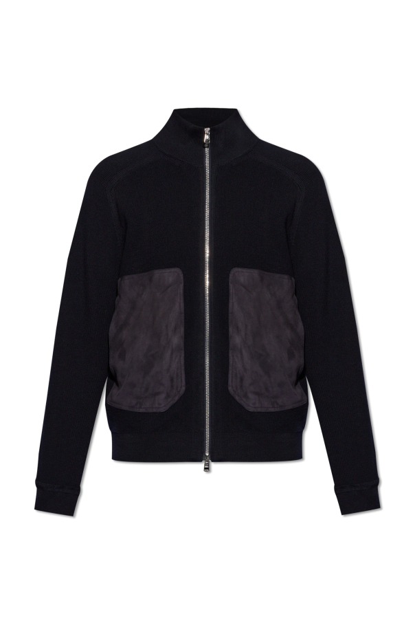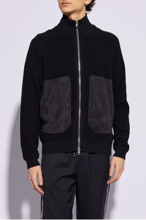 Navy blue cardigan from Moncler. Made from a cotton and cashmere blend, this style fastens via a two-way zip and features two frontal pockets trimmed with suede and long sleeves – one is accentuated with a logo patch.